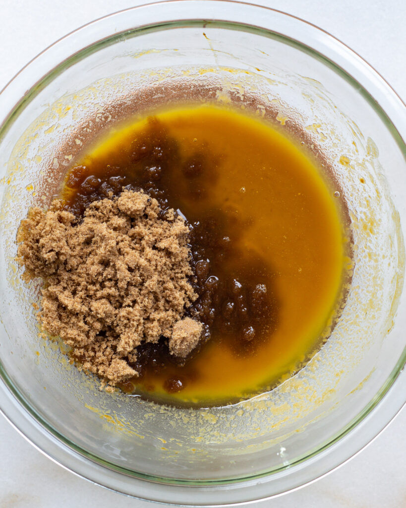 In this batter, the emulsion that needs to happen is between the butter, sugars, oil, and egg. The sugars have a high water content, which is why the butter starts to separate (image above). The egg and oil are whisked separately with the espresso powder to create smooth mixture to start the emulsion. When you gradually whisk the egg batter into the butter/sugar mixture, it almost instantly seizes into an emulsified, smooth and glossy batter. Cooking magic.