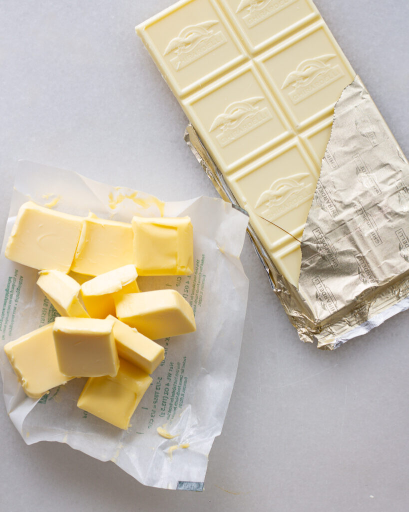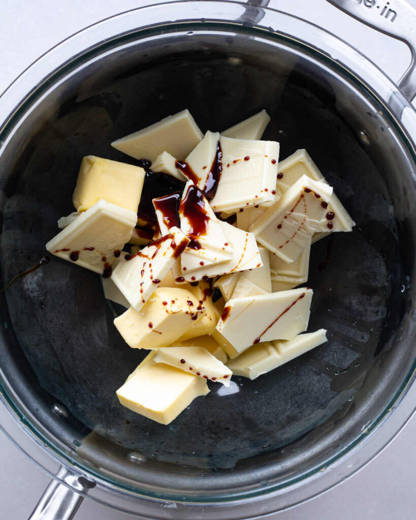 This recipe starts with the melting of white chocolate and butter together. I prefer to do this using the double-boil method.