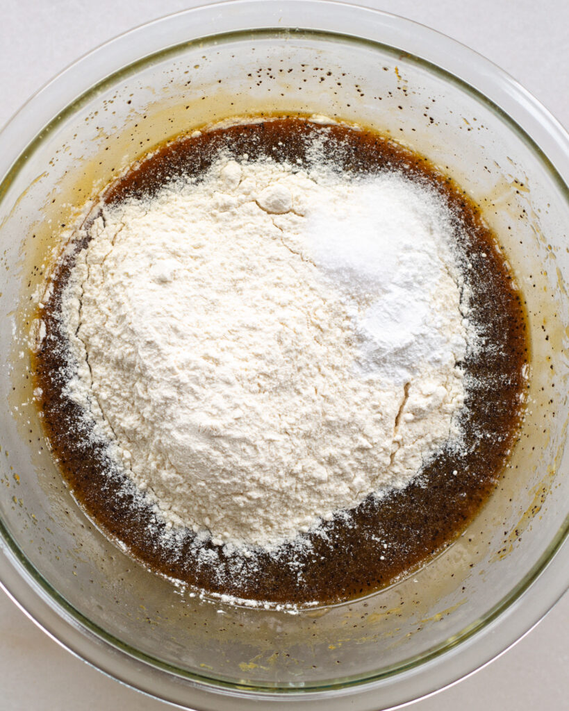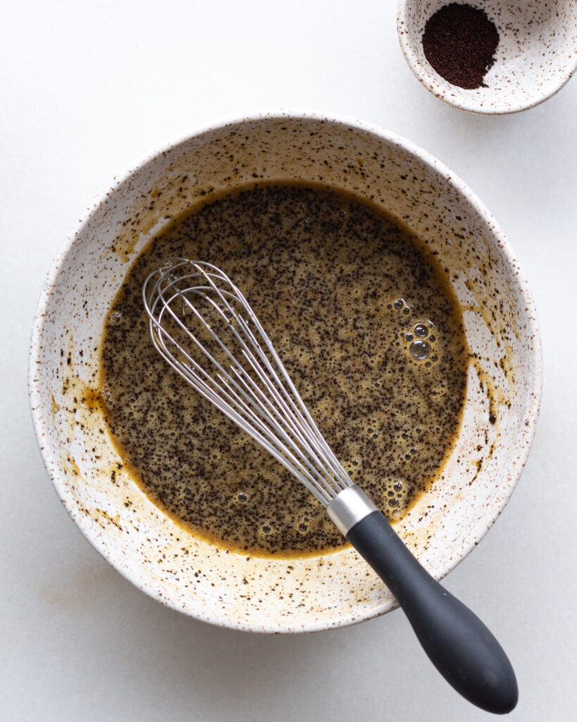 - In a separate small bowl, whisk together the egg, yolks, oil, vanilla, the instant coffee mix and 1 1/2 teaspoon of espresso grounds. Pouring very slowly and stirring constantly, gradually drizzle the egg mixture into the wet ingredients. It should sieze up into a glossy batter. Add the flour, baking powder and salt and stir together with a spatula.