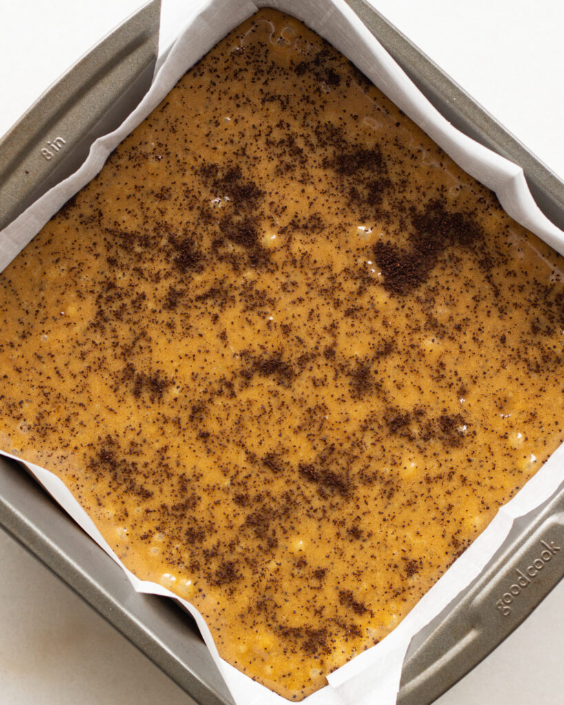 - Pour the batter into a parchment-lined 8×8 inch pan. Tap the pan to evenly spread out the batter, and top with the remaining espresso grounds. Bake for 20-25 minutes or until a toothpick comes out clean.