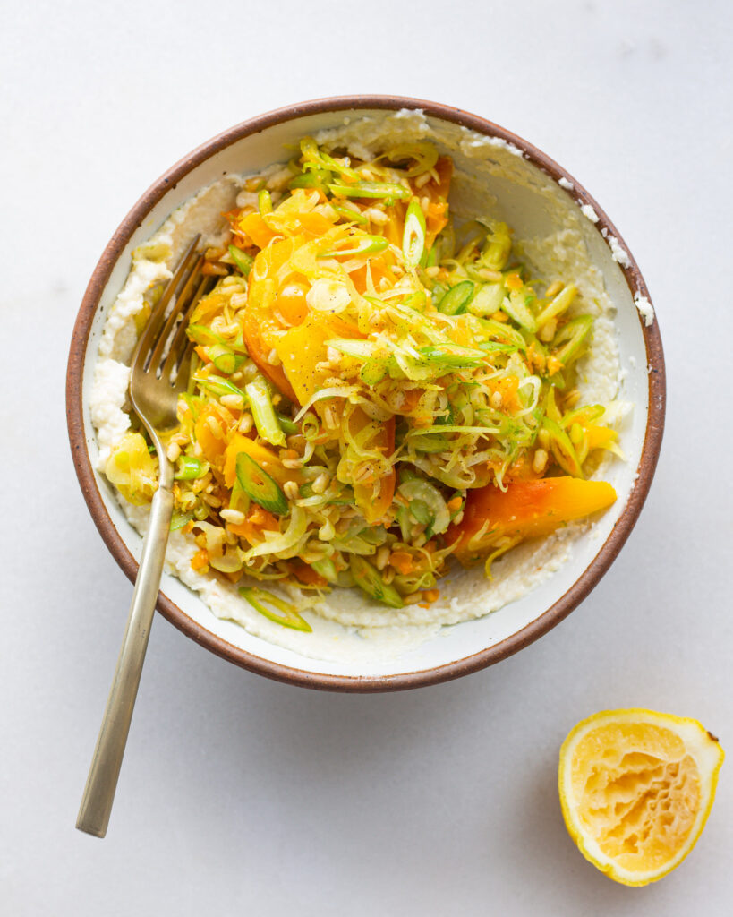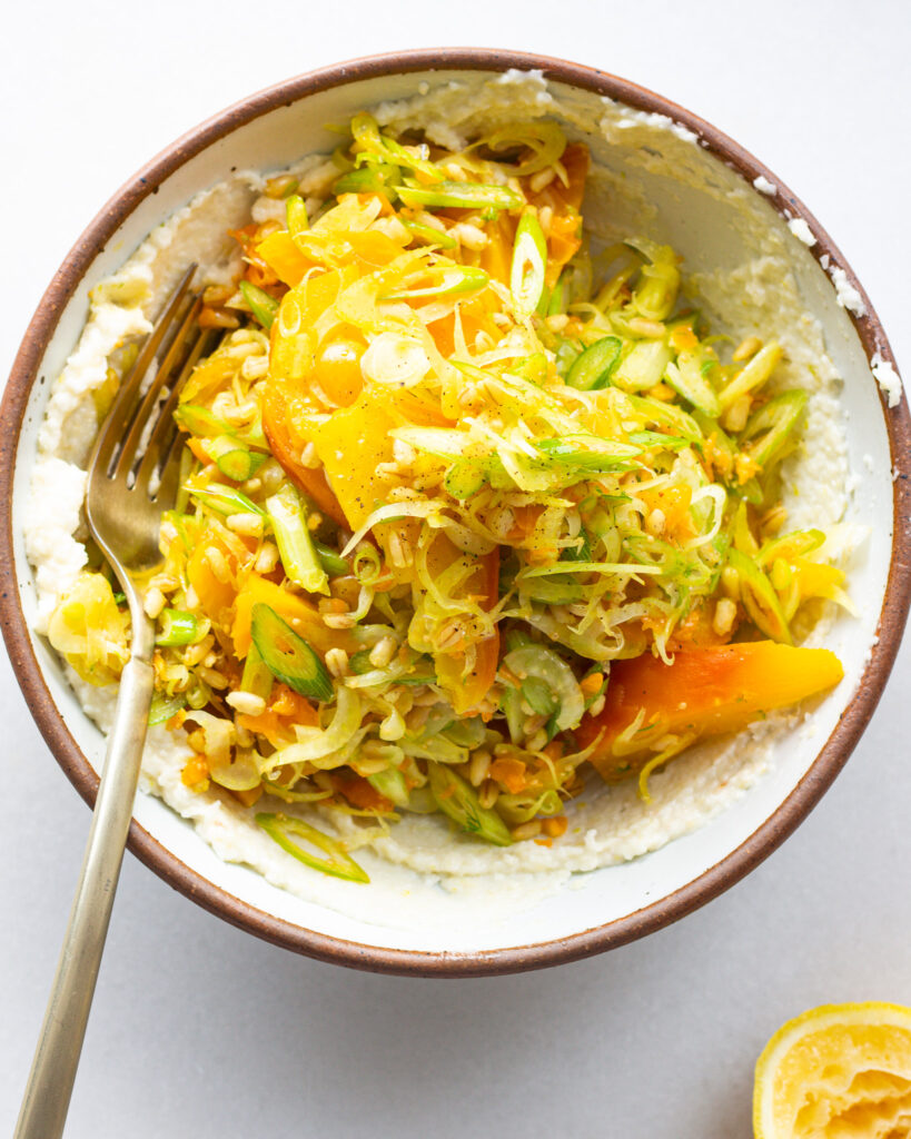 And lastly, this salad uses Toum, which is Arabic for “garlic,” but also the word for a Lebanese garlic sauce. And with a swipe of toum layer the outside of every bowl, you can pick and choose how much garlicky goodness you want in each bite. The salad almost melts into the sauce, making it one of my favorite ways to play with my food.