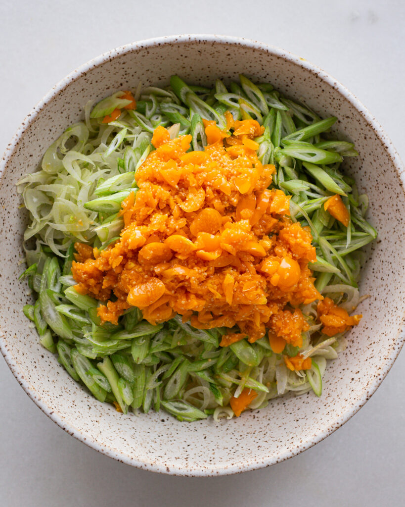 This fennel salad is coming to you with a lot of components, all of which together build the “dressing” of the salad.