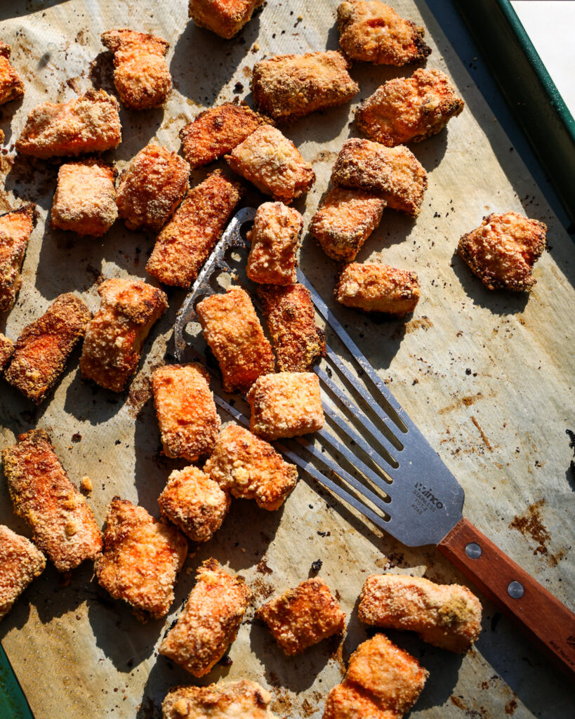 For a dairy-free nugget, use a coconut yogurt or a cashew cream to mimic what the yogurt is doing here. You just want something with a bit of fat that can adhere to the salmon and make it tender while allowing the breading to crisp up in the oven.