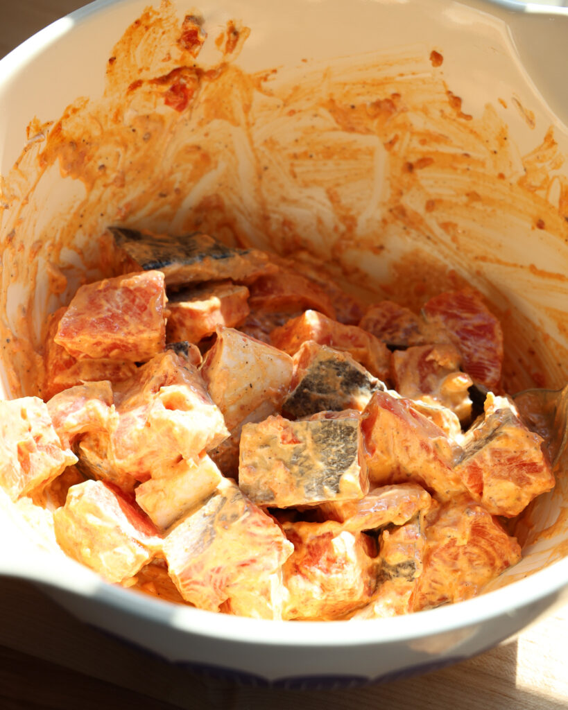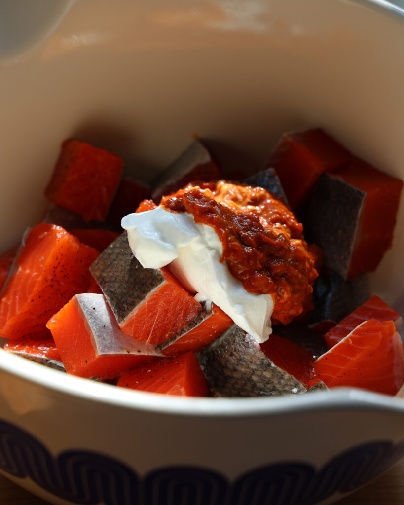 - Add the salmon pieces to a large bowl, add in 1/4 cup of greek yogurt and 2 tablespoons mild harissa paste. Mix well so that the salmon is fully coated. See Note.