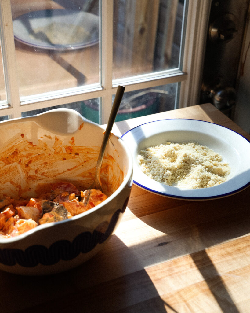 - In a small dish to the side, add the 2/3 cup of almond flour and season with 1/2 teaspoon flaky salt. Toss to break up any clumps.