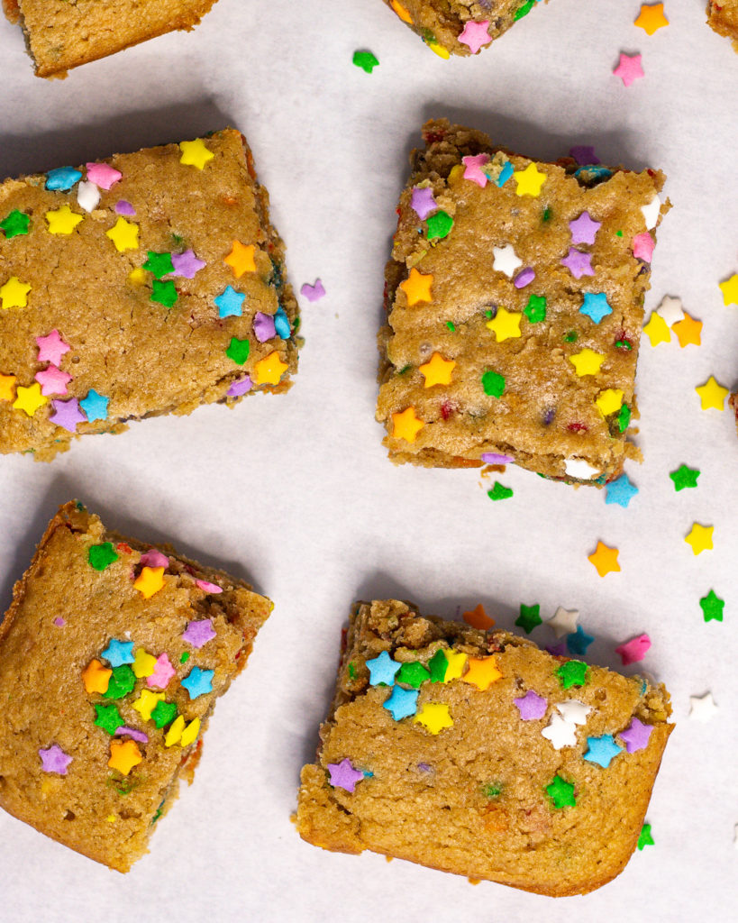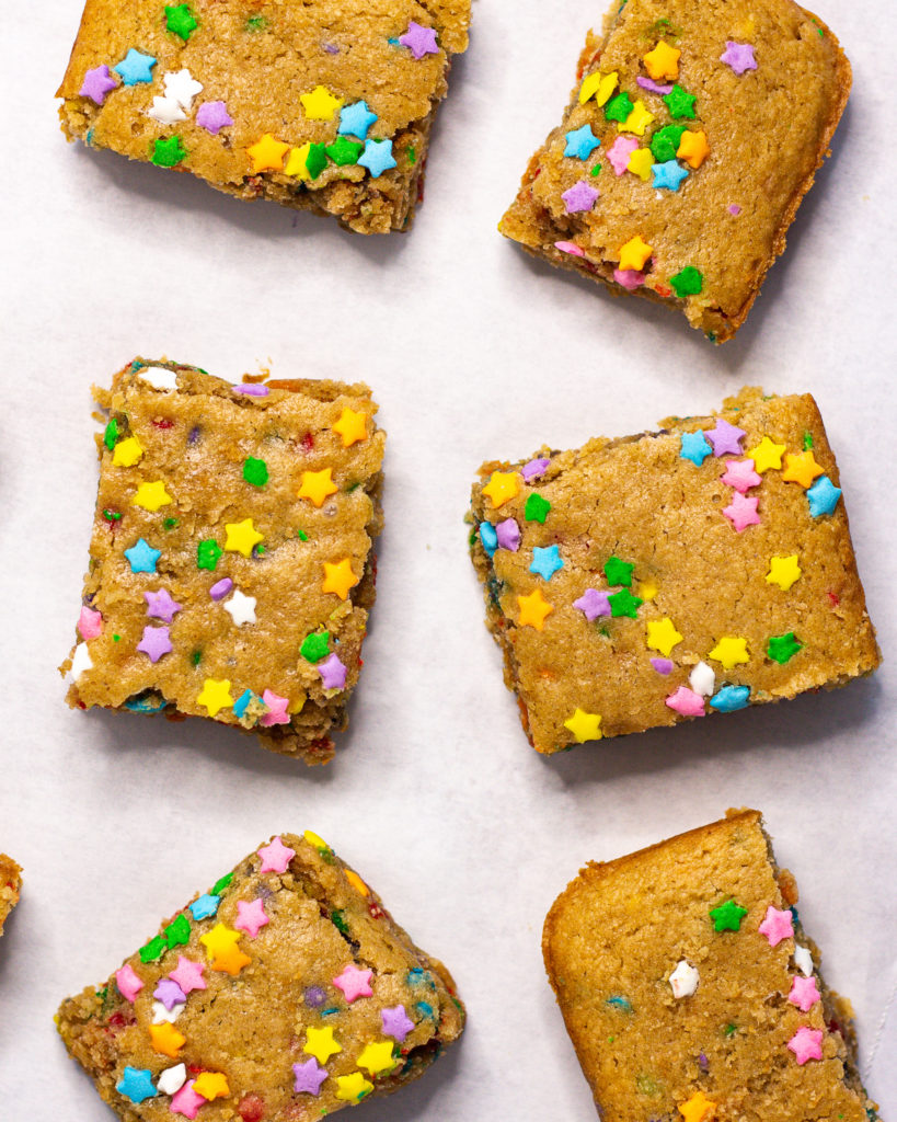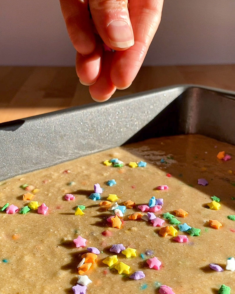 - Pour the batter into a parchment lined 8×8' baking sheet. Top with extra sprinkles.