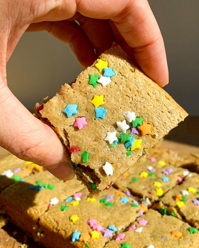 - After the batter is mixed, pour it into a parchment lined 8×8′ baking sheet. Top with extra sprinkles, bc why not?