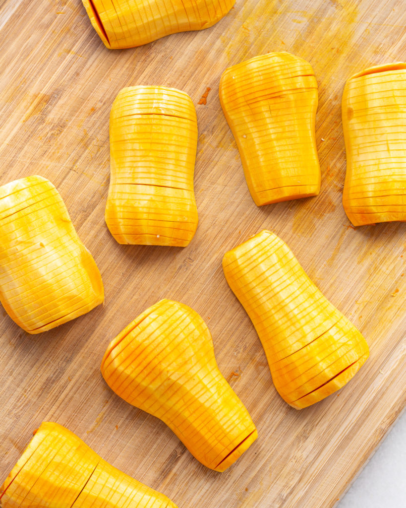 This part is the fun part, but it can also be a bit tricky. This recipe calls for the squash to be accordion-cut to help absorb the glaze, but it’s by no means mandatory. You can also opt to cube and glaze the squash, but I just find this method a bit more fun. Here is how I suggest cutting the squash:
