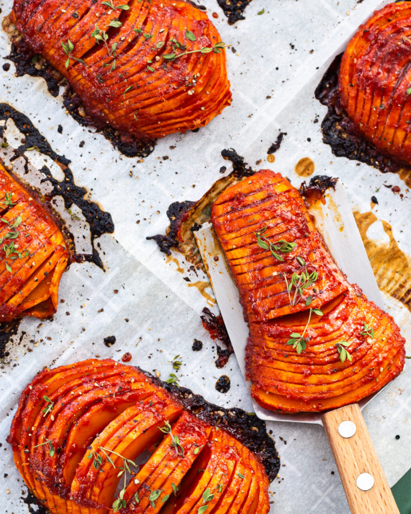 Squash season is my favorite season because squash are just so versatile. And also they are a vegetable that gives me that starchy-potatoey fix, what’s not to love y’know? You can roast them, you can pan fry them, and we’ve seen Trader Joe’s go even as far as mac n’ cheese. But sometimes my favorite method is just a sticky glaze and a really easy roast. And this spicy-glaze recipe is exactly that.