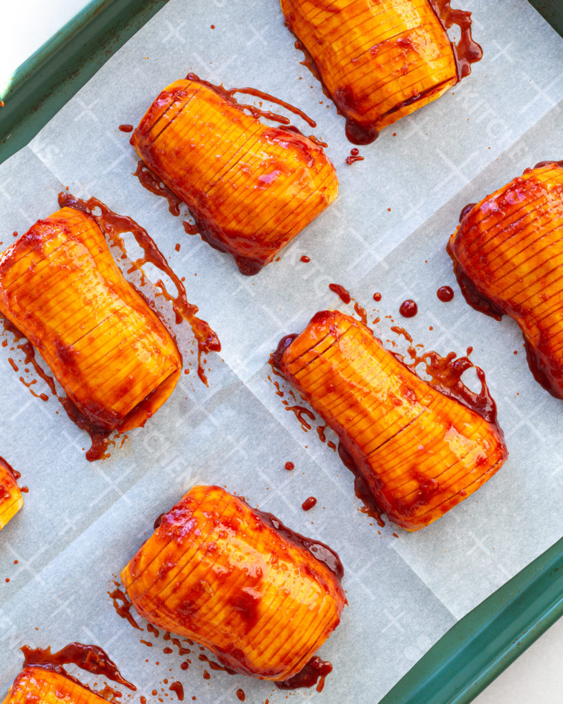 - Take the squash out of the oven and switch the oven setting to "broil." Cover the squash with a liberal layer of the glaze. The squash accordions should have pulled apart a bit, so get the glaze in the crevices.