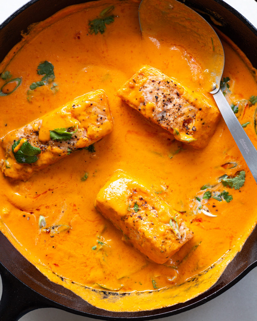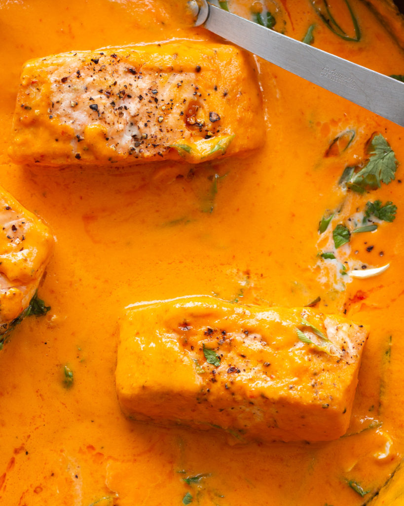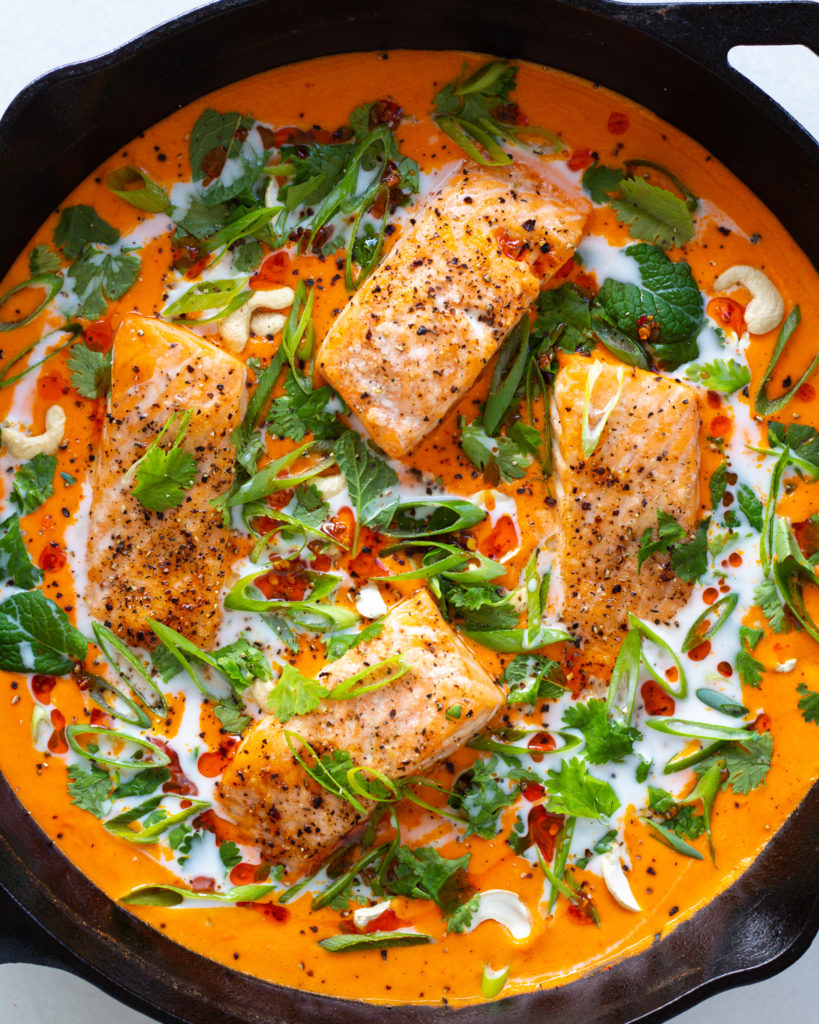 Top the salmon with coconut milk, cilantro, scallions and chili oil if you’d like, and serve family style with rice or grains.