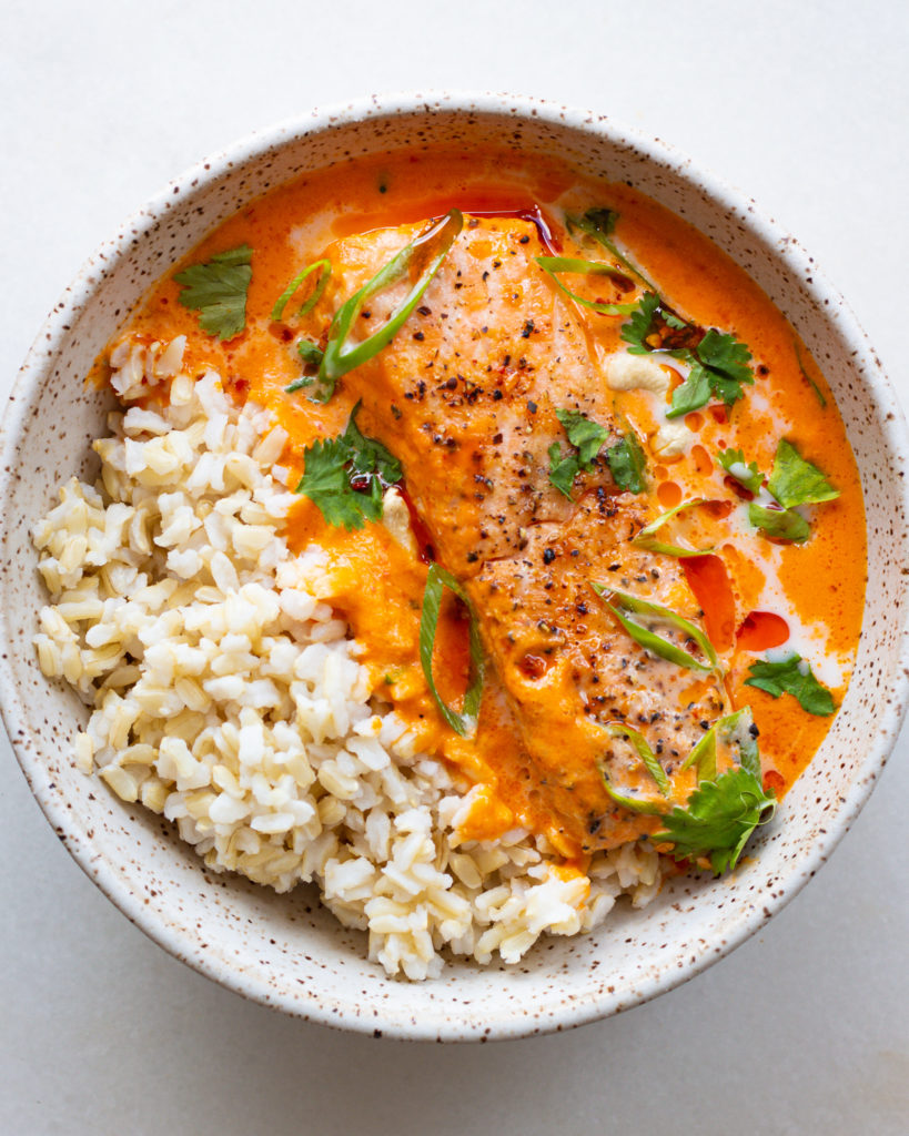 - Top the salmon with coconut milk, cilantro, scallions and chili oil if you'd like, and serve family style with rice or grains.