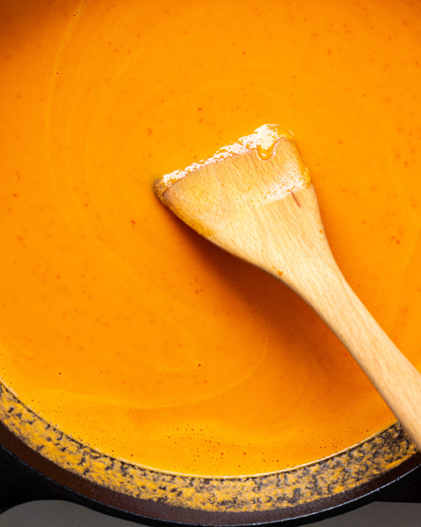 Add the plant-based milk to the habanero sauce and continue to stir. When the sauce is very creamy, reduce the heat to low.