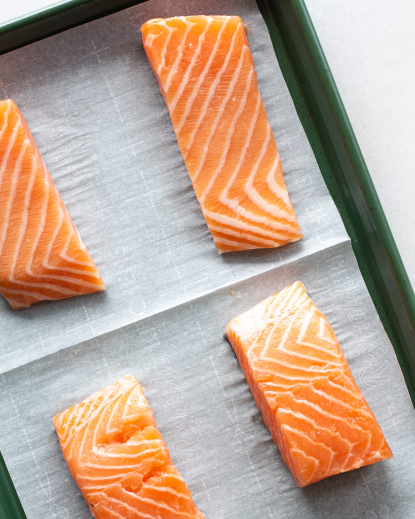 - Portion 1 pound of salmon into 4 fillets, season with salt and pepper and place on a parchment lined baking sheet. Set them aside.
