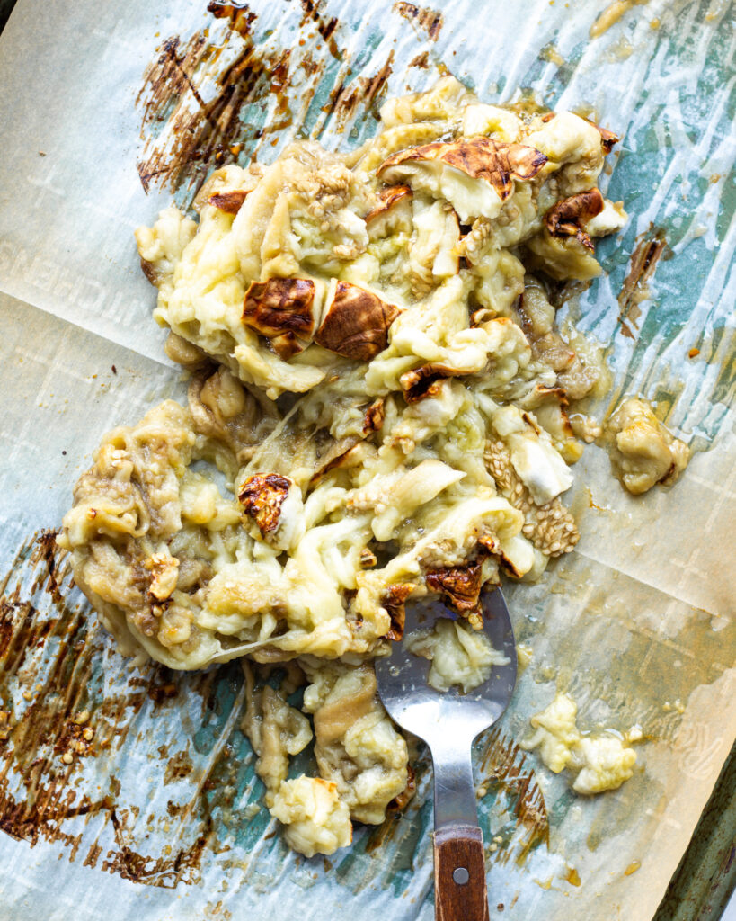 - By now the eggplant should be out of the oven. Scrape it away from the skin, creating an eggplant-mash. Scoop the mash directly into the pan with the red onion. Stir to combine.