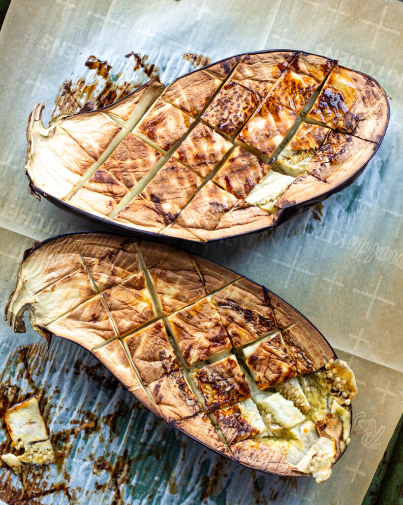 - Halve the eggplant, score it in a criss-cross pattern, going about 1 cm deep. Sprinkle the cut sides of the eggplant with a few big pinches of salt and let sit for 30 minutes to pull out any excess moisture.