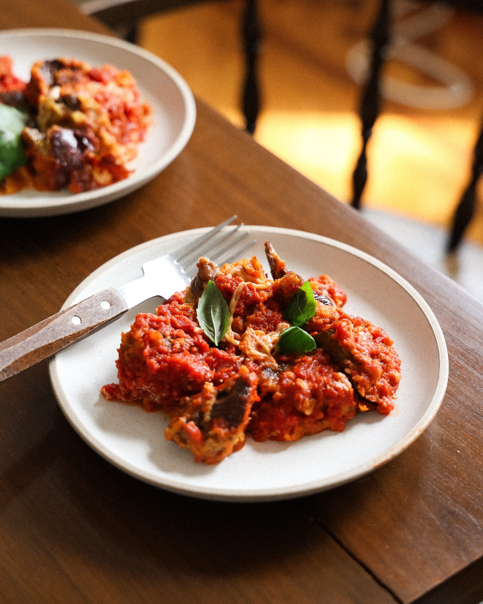 Tomatoes are the most common base for shakshuka, but here the eggplant really makes up the bulk of it! It still is a vegetable stew simmered with tomato juices and finished with eggs on top, so it felt fitting to keep it in the shakshuka family.