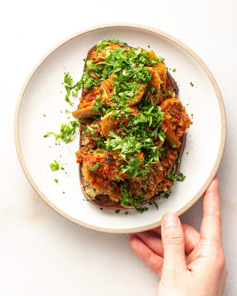For plating, my biggest tip is that…you can eat these how you want! In this blog post I put these artichoke hearts on toast, but they are amazing with rice, with crispy chickpeas, on their own, or even as part of a salad or sandwich! Feel free to get creative with your base, the flavor will still always come through!