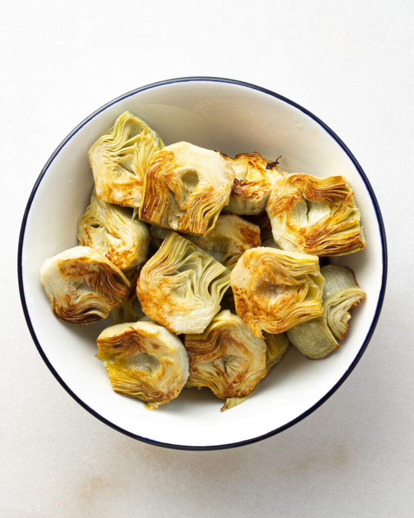 I always recommend draining and rinsing artichoke hearts well, just to get out any excess salinity. From there, I put the sauté pan on medium heat, add a good glug of olive oil and sear the artichoke hearts on each side for about 2-3 minutes. This softens their already soft texture, gives them a beautiful golden brown color, and preps them for the rest of the recipe!