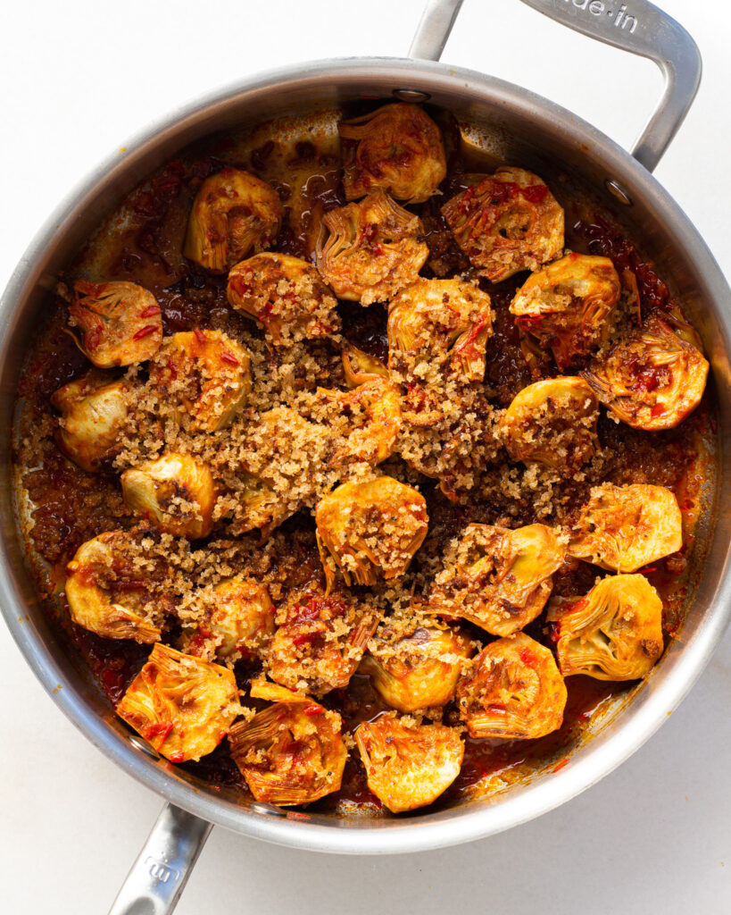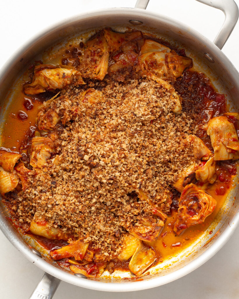 And it’s not a stew, it’s a “simmer.” You first sear the artichoke hearts to get nice color on them, then let them slowly cook in a simple harissa broth to develop a lot of color and flavor. The texture is tender, but you counteract it with breadcrumbs on top and a crispy toast below. Add in some hummus and it’s a perfect easy weekday meal! Plus it’s just so cozy. Yet another reason to love simmer season!