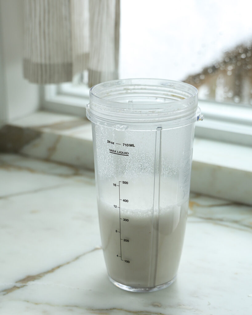 - Add the 1/2 cup of cashews to a small blender. Cover with 1 cup of water, season with 1/2 teaspoon of salt, and set aside to soak while you prep the rest of the ingredients.