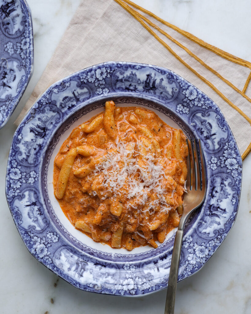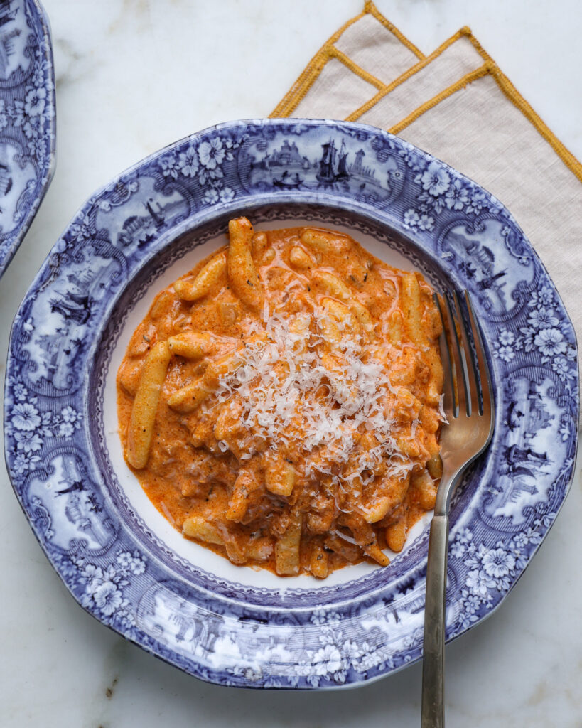 In truth, it’s not fully clear where vodka sauce comes from. Cream is classically un-Italian, so its roots often come into question. Many say it is Italian (I think they’ve earned it by now), but others say it’s Italian-American. And then in a fun twist, some say it was invented by Big Vodka (vodka manufacturers) who claimed it was Italian. All we do know for sure is that the sauce is smooth, creamy, and made with some form of tomatoes, cream, and a splash of vodka. We also know it became popular in the U.S. some time in the late ’70s and early ’80s, and is still popular now!