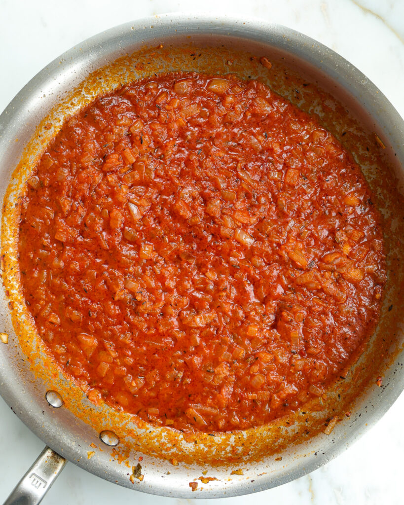 - Char the tomato paste. Tomato paste is only delicious cooked down. Cook the tomato paste in the pan until it’s a shade darker in color, and you’ll release a whole new layer of flavor for this sauce.