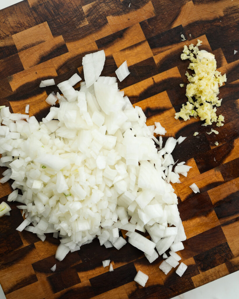 - Dice up 1 yellow onion and grate 4 garlic cloves.