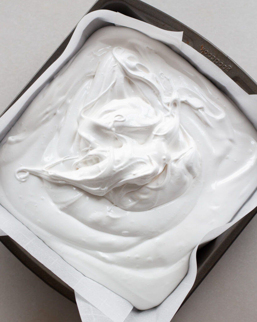 - Pour the marshmallow mixture into the baking pan, dust the top with a light sprinkle of cornstarch then let it set for at least 4 hours.
