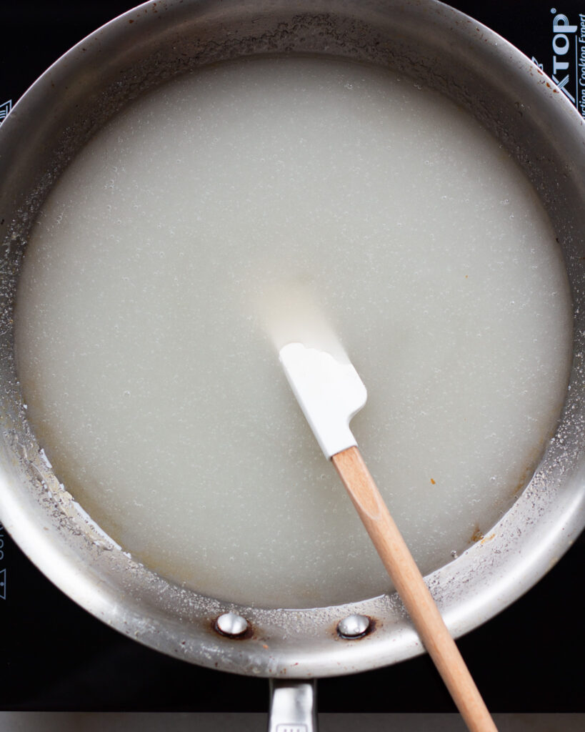 - Set a medium pan over medium heat. Add the sguar, corn syrup and remaining 1/2 cup (118g) of water. Bring this to a boil and let the mixture bubble for 2 minutes.