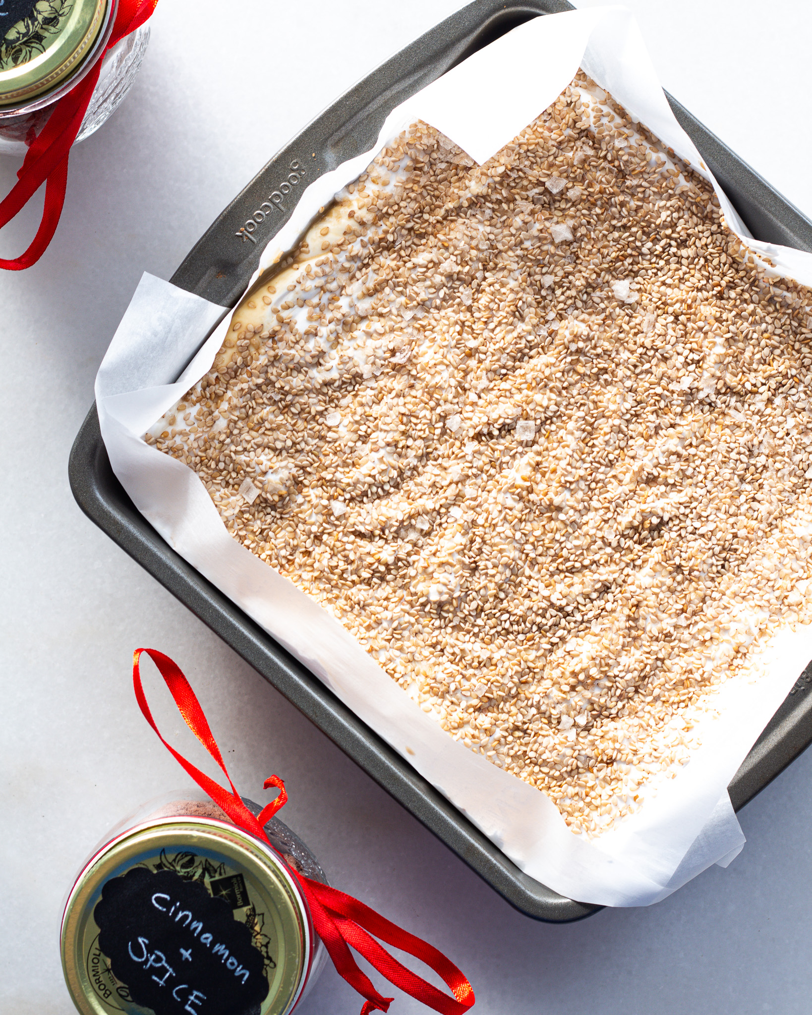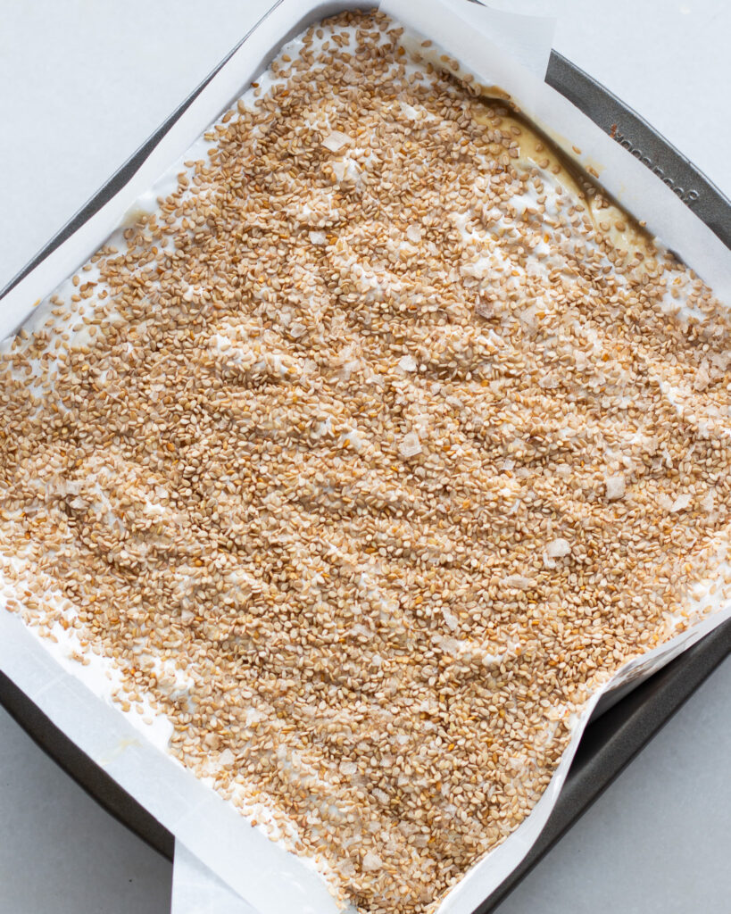 Add another half teaspoon of Diamond Crystal kosher salt to the marshmallow mixture during the last minute of beating. Portion the marshmallow mixture into the baking dish, but dot tahini all over the top. Use a toothpick or knife to swirl the tahini into the marshmallow. Instead of sprinkling cornstarch, sprinkle a generous layer of toasted sesame seeds on top. Add a sprinkle of flaky salt before letting the marshmallow set. Â