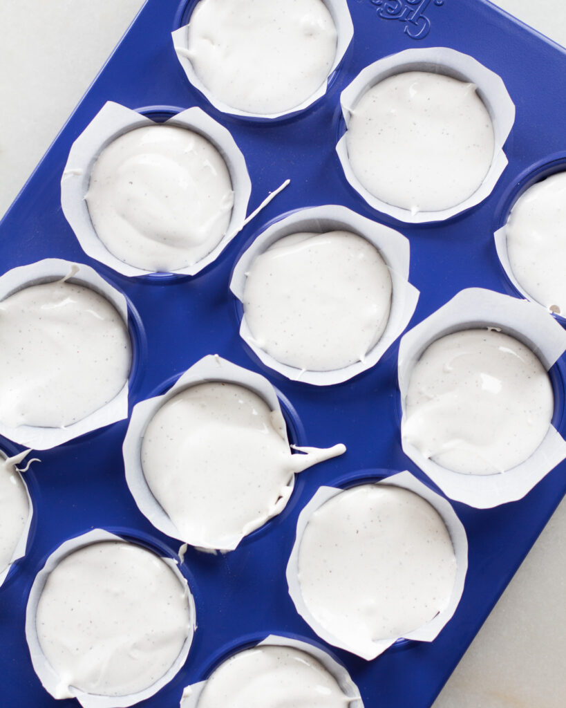 I like to mold my marshmallows either in an 8×8 baking dish, so you can cut big, fluffy squares, or in a muffin tin, so they are circular and will fit perfectly into your mugs!