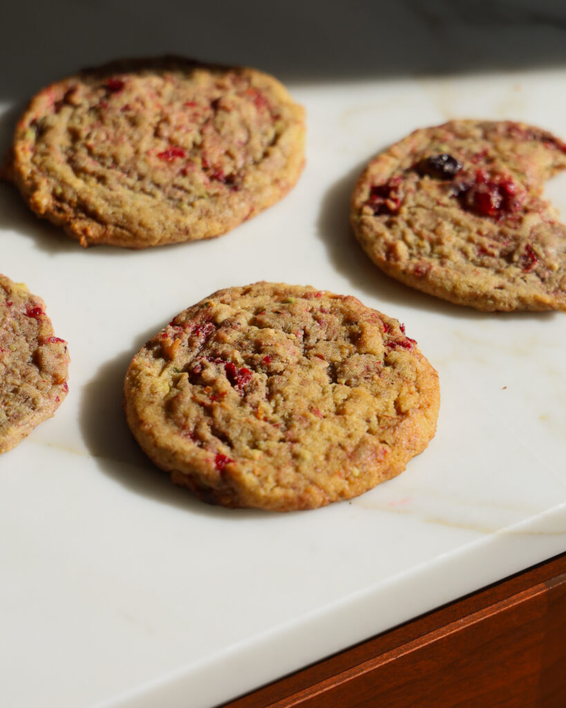 Wow, I have really been on a kick with long-name recipes lately, but I can’t help it!! These cookies have a lot to give and I couldn’t leave a single thing out. So I’d like to present Honeynut Cookies with Pistachio Chocolate and Cranberry Swirl, my latest favorite cookies, because wow are they delicious.