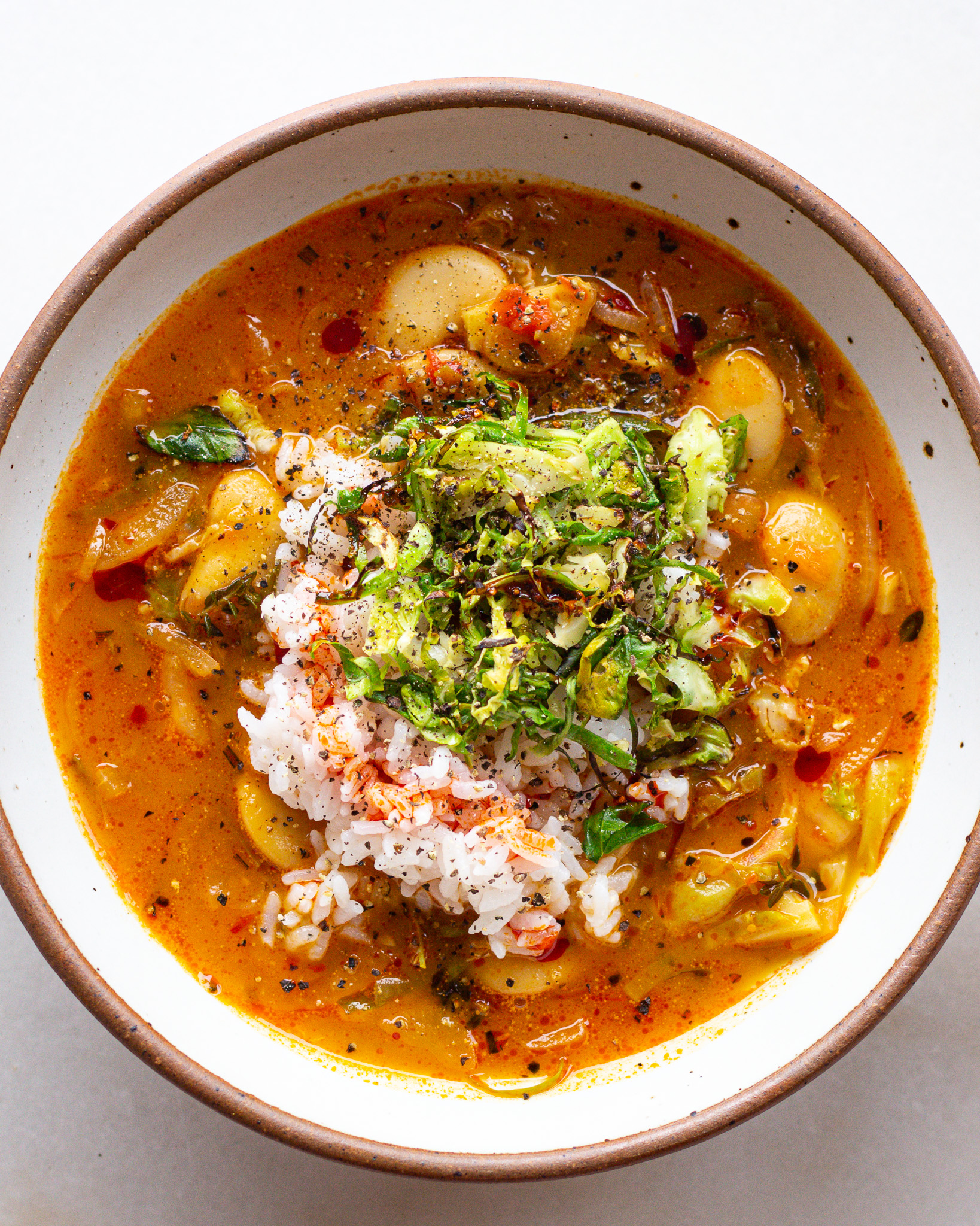 - To serve, generously portion into 4 bowls, top with the charred Brussels sprout shreds and eat with either crusty bread or warm rice.