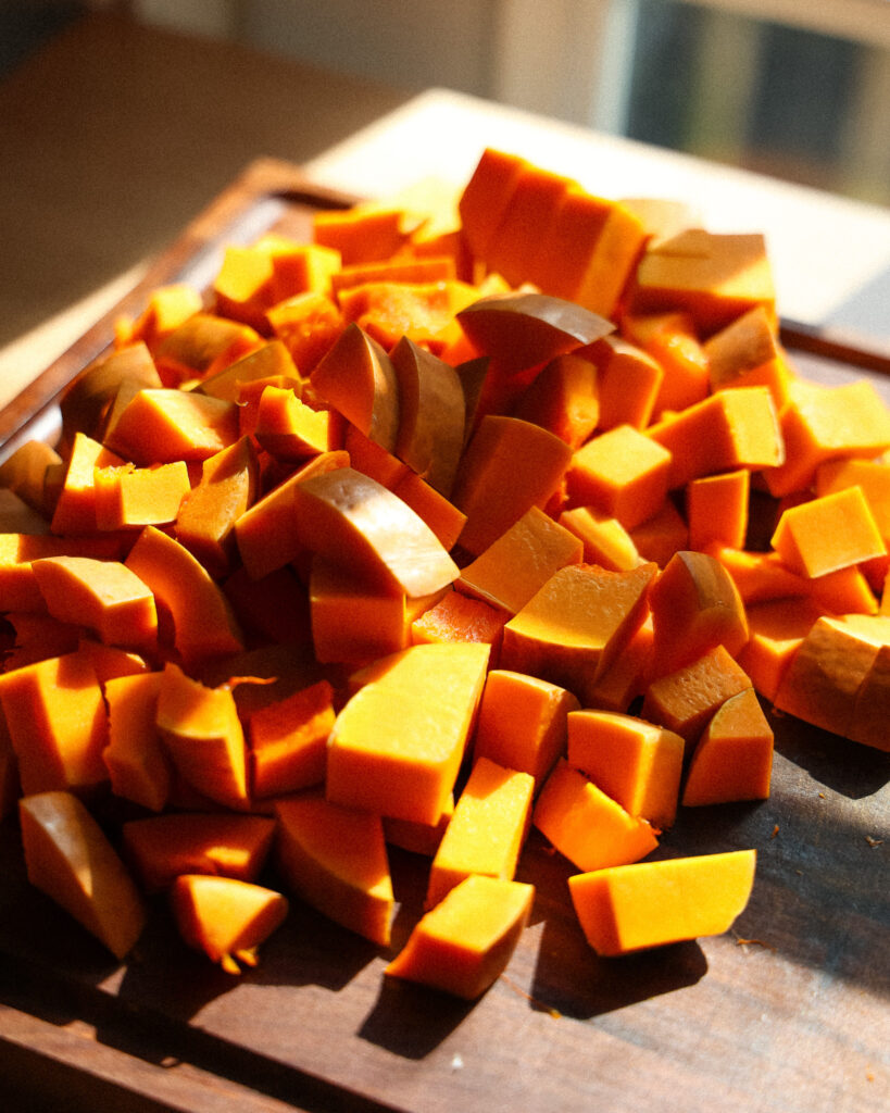 - Core and cube the honeynut squash into 1-centimeter square pieces, but they can be a bit uneven, don’t sweat it.