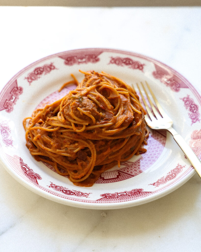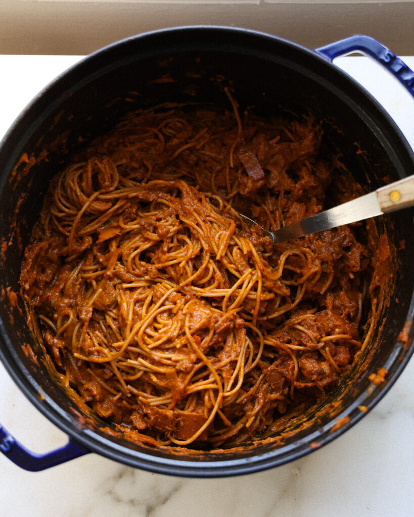 - Mix the pasta into the sauce, adding splashes of pasta water as needed. I usually end up adding 1 cup to 1 1/2 cups of pasta water.
