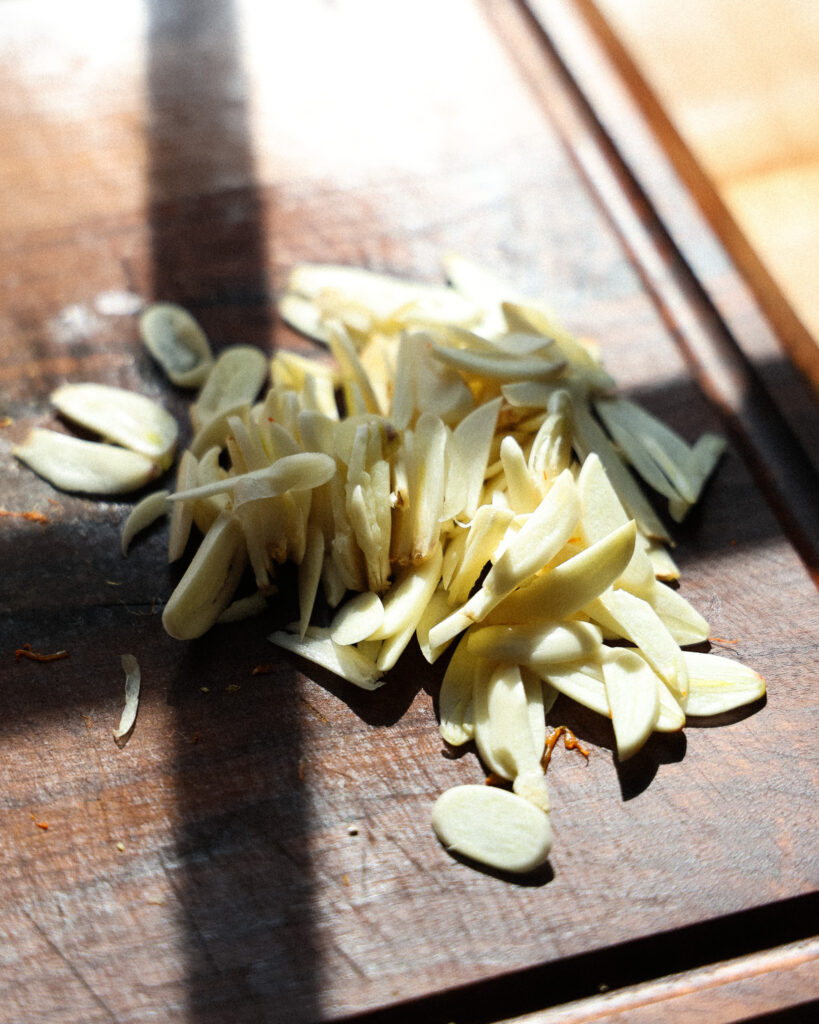 - Thinly slice 12 garlic cloves.