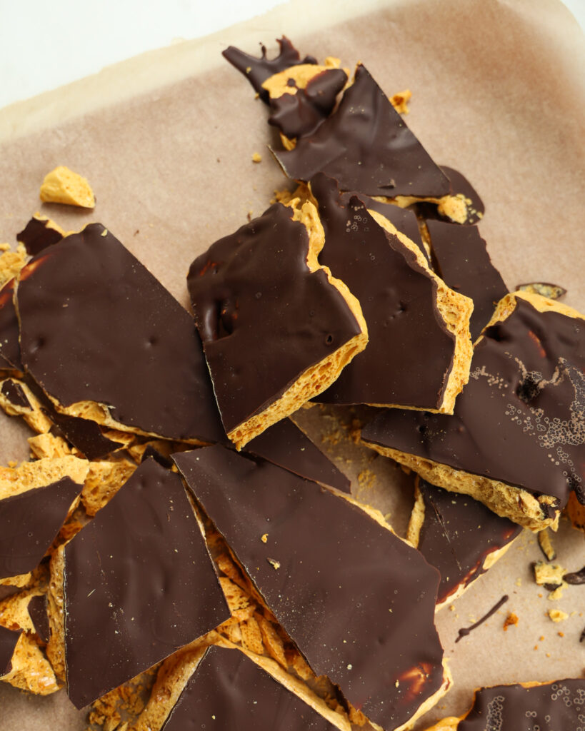 I had never made honeycomb before, but it really is just heating up sugar and honey until it’s bubbling, then adding baking soda and pouring it out. It’s so surprisingly easy and fun that I will for sure be making it again. Plus, it keeps forever.