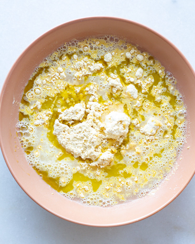 - Whisk together the chickpea flour, 1 tsp of olive oil, water and then season with salt and pepper to taste. Whisk thoroughly so there are no clumps