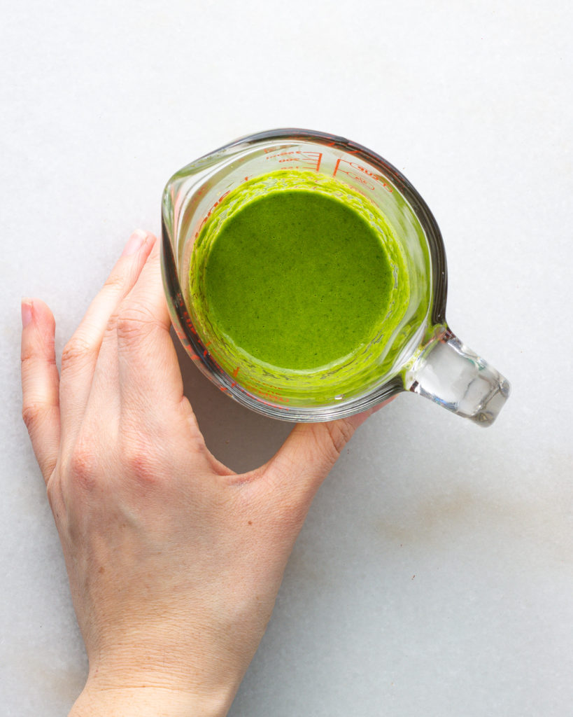 - While the socca is cooking, make the dressing by blending together the parsley, garlic, lemon juice, 1/3 cup olive oil and salt and pepper to taste.