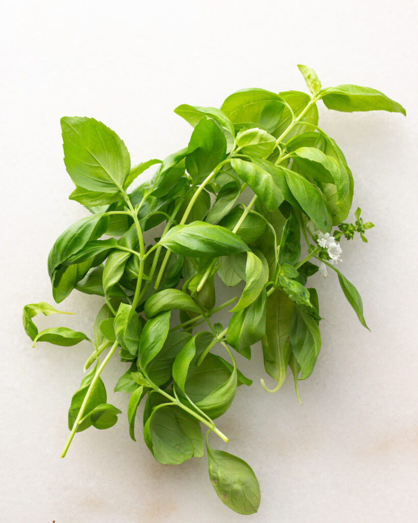 To make this vinaigrette there’s no blanching, no mortar-and-pestle, no chopping. Just combine the basil, vinegar, olive oil and salt in a blender and add in 1/4 cup of ice water. Make sure the ice water is ice cold.