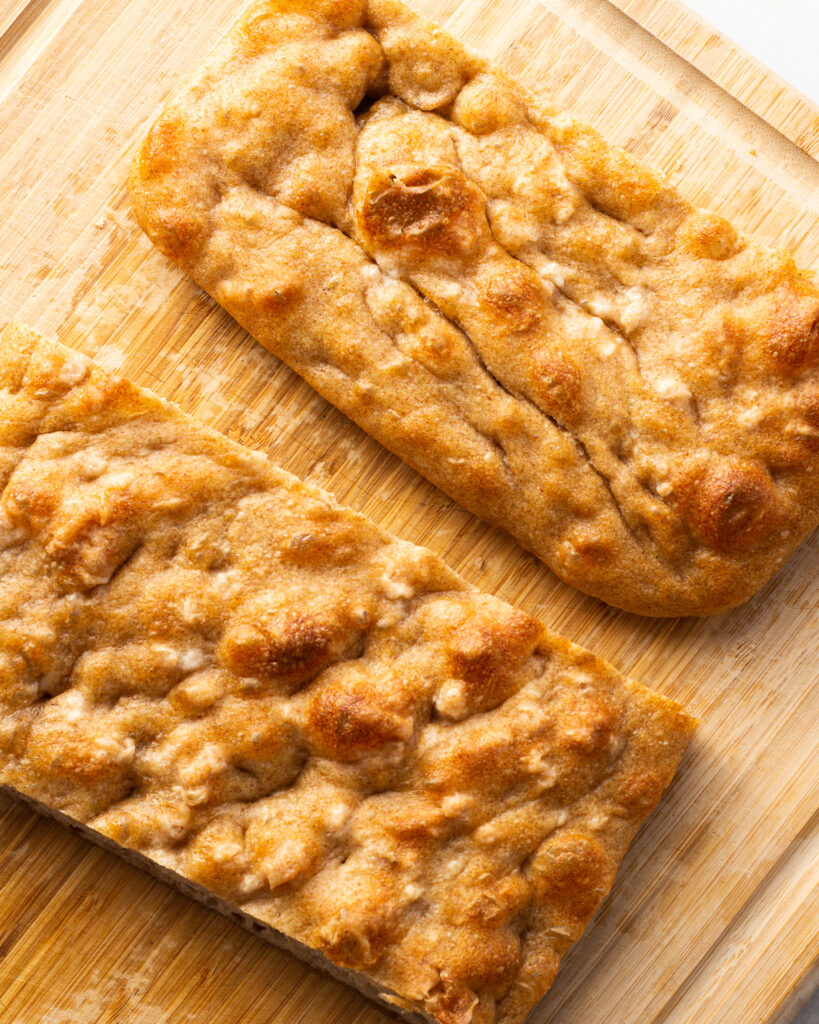 - 1/2 serving whole wheat focaccia recipe, cut into two long pieces
