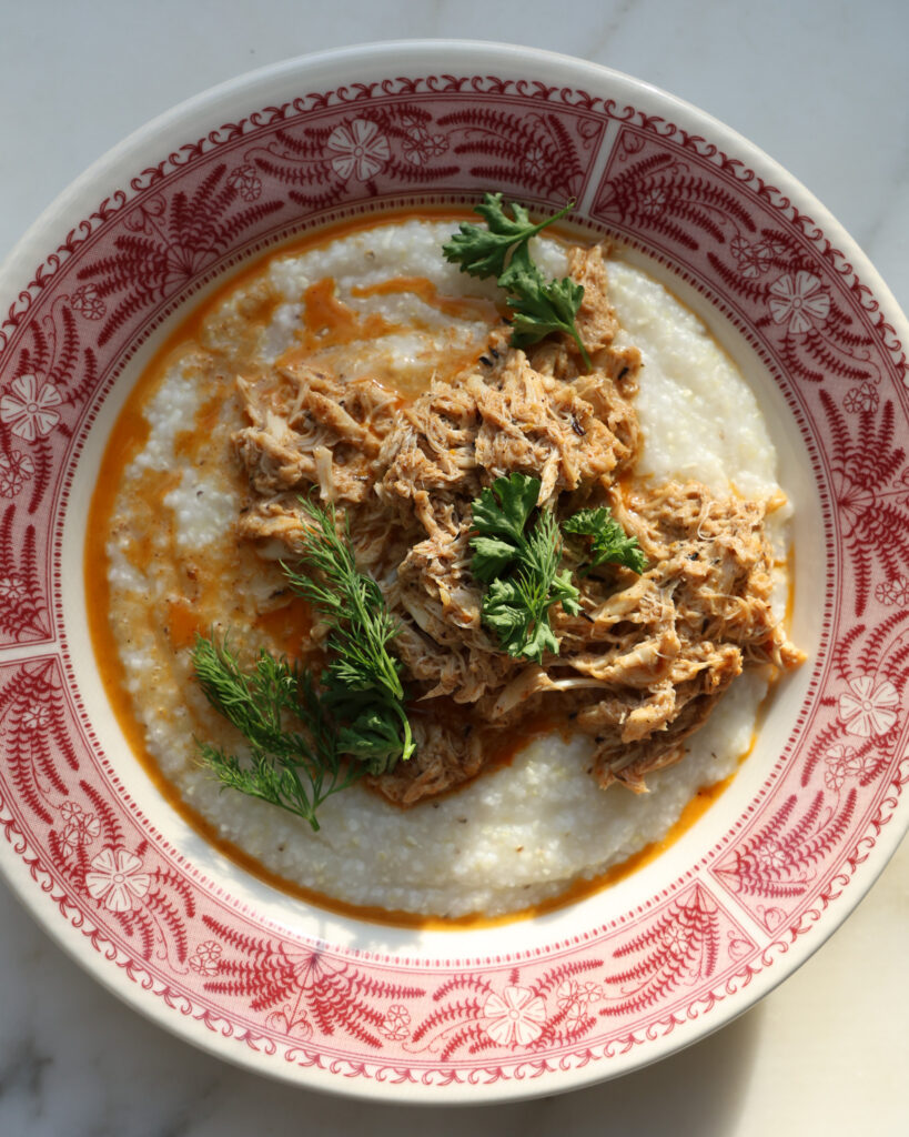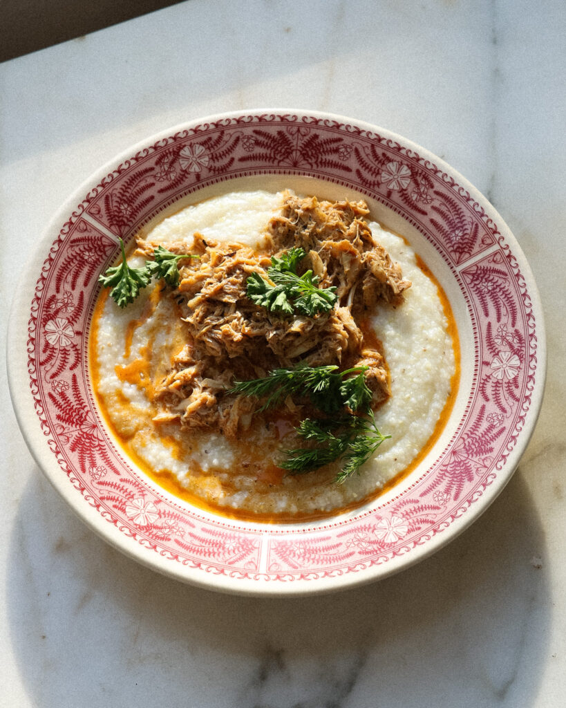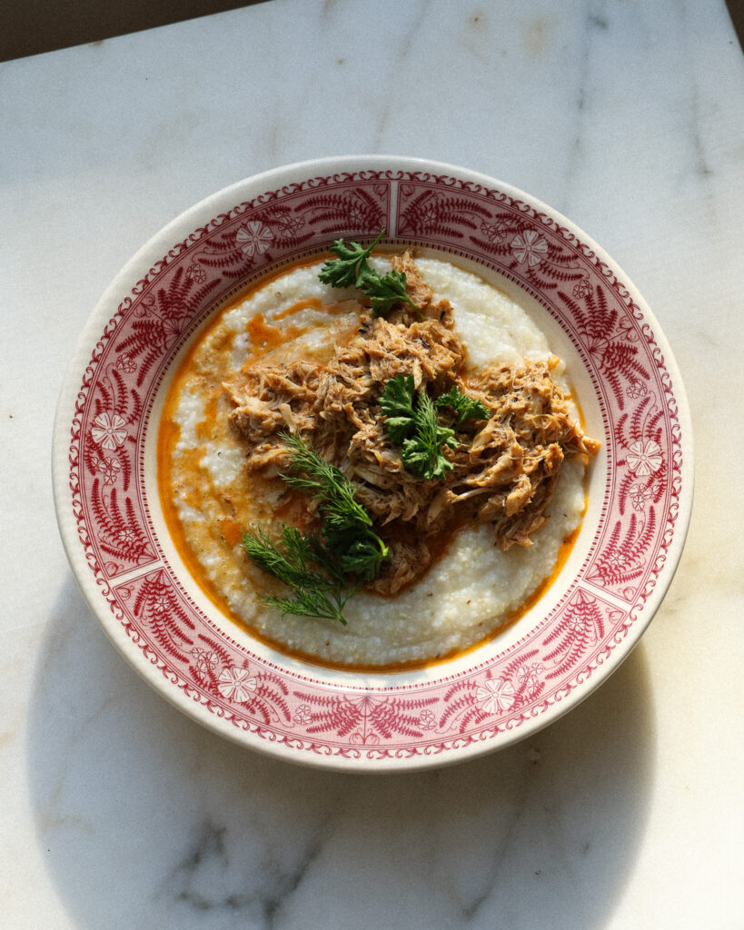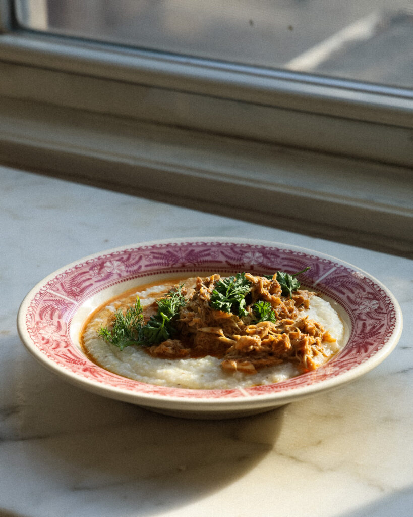 - Now the grits should be done. To serve, portion the grits in to four bowls and top each with a generous portion of the crab. Tear over some tender herbs and serve with a lemon wedge!