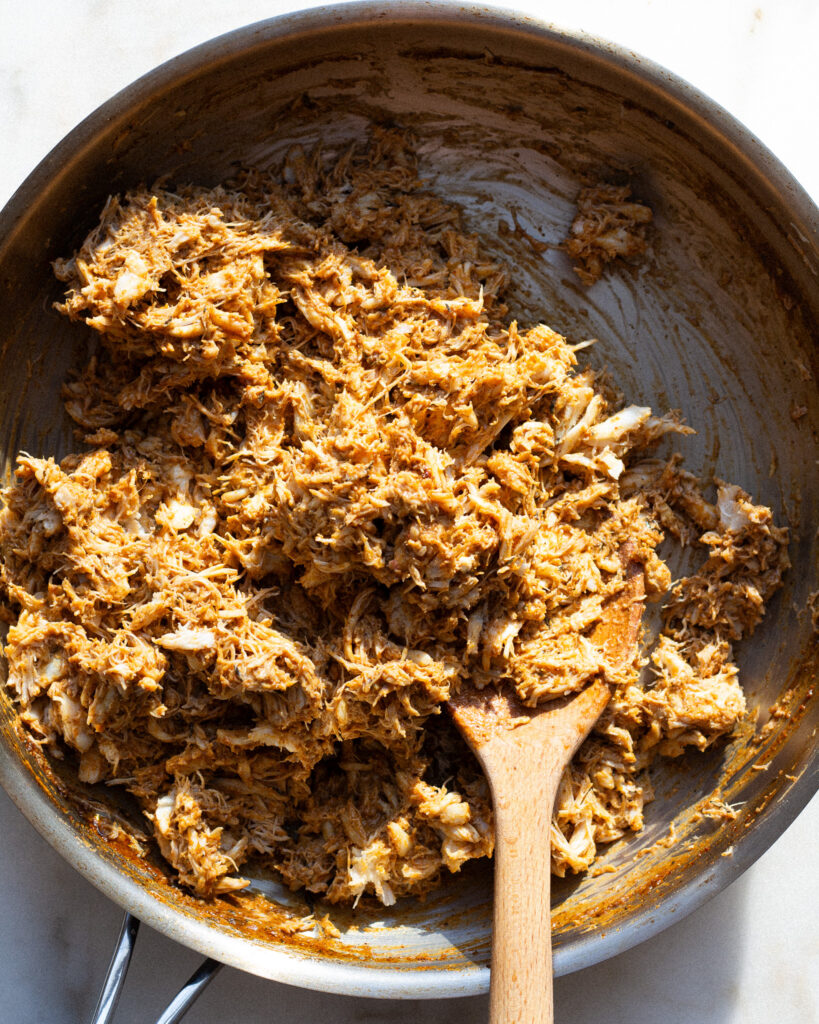 The crab will luckily soak in all the black and blue sauce as soon as you add it to the sauce. This is great for flavor, but not so great for texture and temperature. You want to ease the crab up to the same temperature as the sauce. I like to do this by adding a splash of water to help loosen the sauce around the crab, and then bring that to a simmer so the crab can slowly come to my desired temperature.