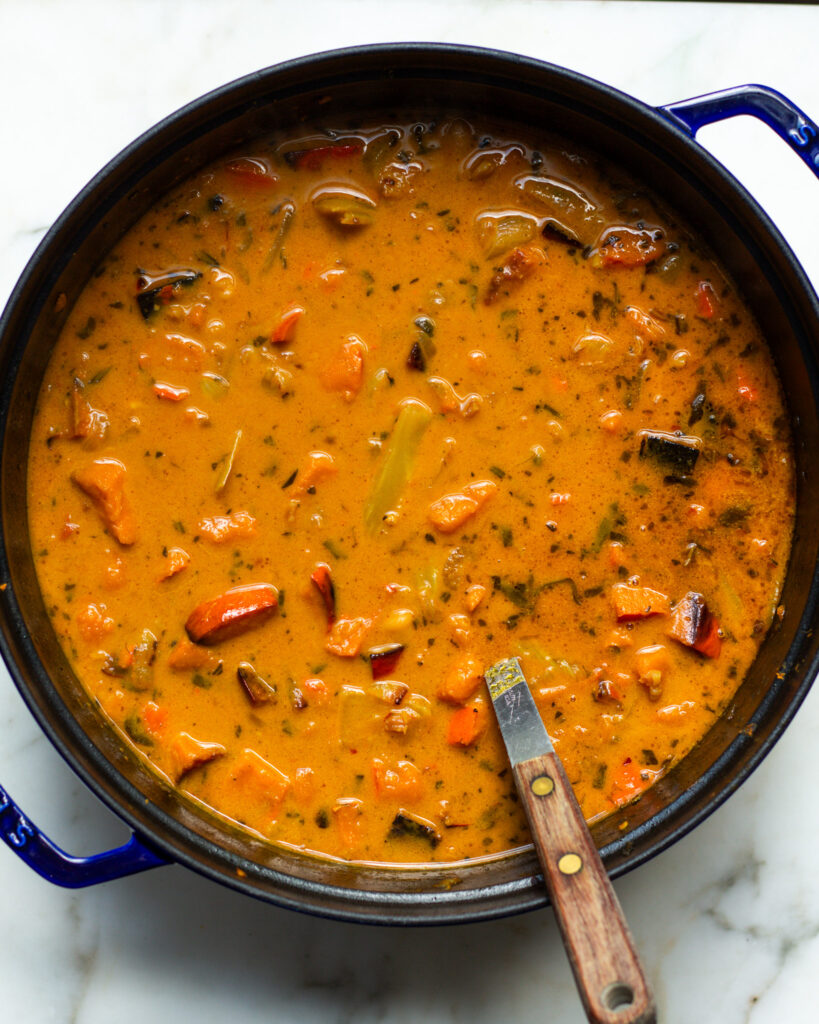 - Bring the pot to a low simmer, cover and let cook for 20-35 minutes. The longer it simmers, the more flavor you will build from the charred vegetables.