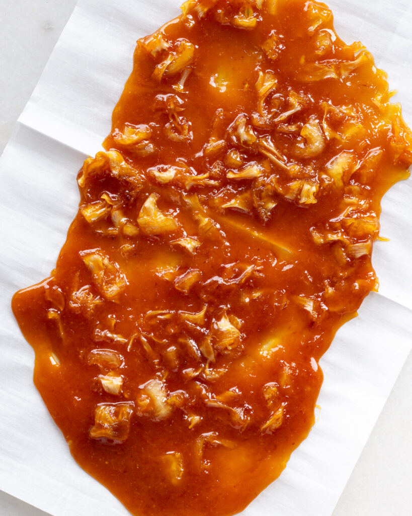 - By now, the caramel should be cool enough to handle, although still a bit stretchy. Begin pulling it apart into pieces no bigger than a bean, and add those pieces to the batter. Mix to combine.
