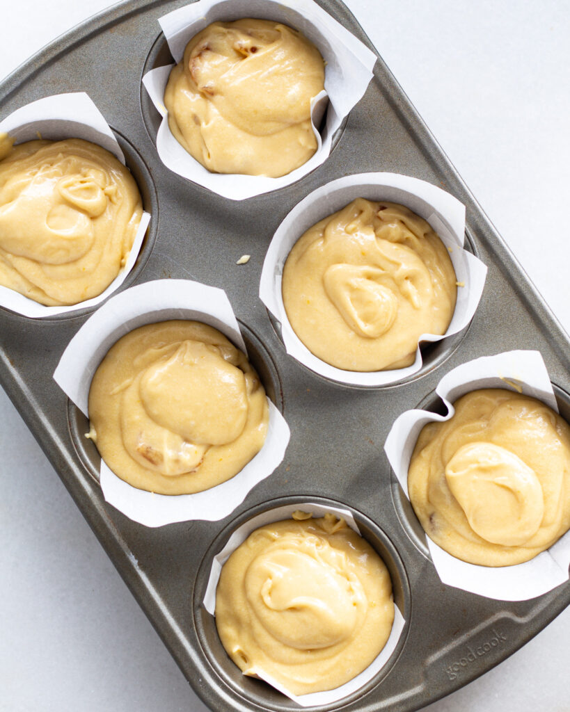 - Line a jumbo muffin tin (or a standard 12-count muffin tin) and scoop in the batter. You want it nearly to the top of the tins, but not completely.