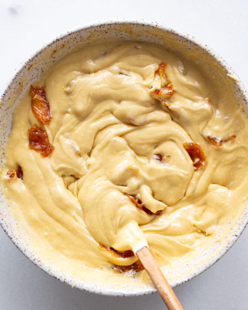The remaining batter is very much whisk-and-mix. The caramel will cool while you do this, so there’s no rush: