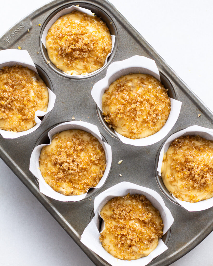 (I did a 50/50 substitute of sugar and brown sugar for the turbinado sugar and it worked out well. I would recommend doubling citrus sugar on top of the already doubled recommendation if making 24 muffins.)