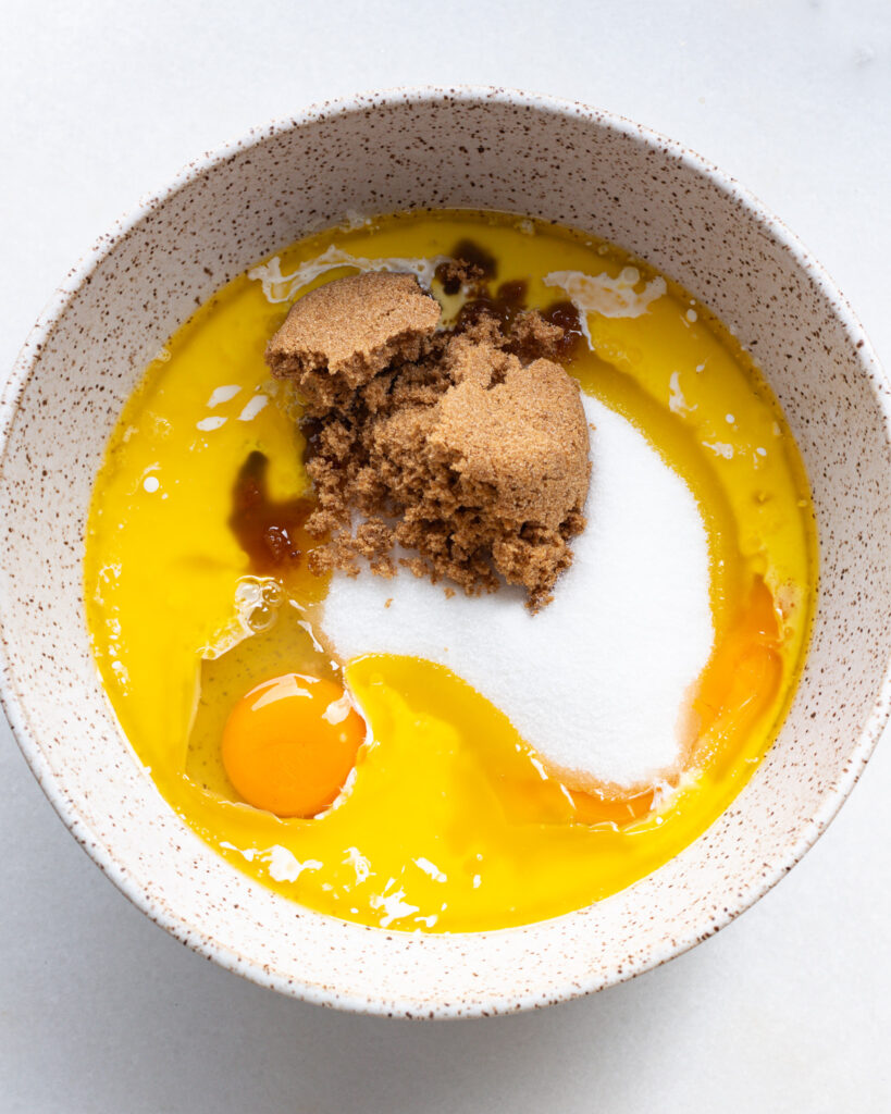 - To make the batter, in a large bowl whisk together the melted butter, sugars and eggs. Add in the cream and vanilla and mix again.